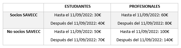 El precio para estudiantes es de 30€ (socios SAVECC) o de 50€ hasta el 11 de septiembre, y después de esa fecha de 40€ (socios SAVECC) o de 70€. El precio para profesionales socios de SAVECC es de 60€ (hasta el 11 de septiembre) o de 80€, para los no socios de 100€ o de 140€ (después del 11 de septiembre).