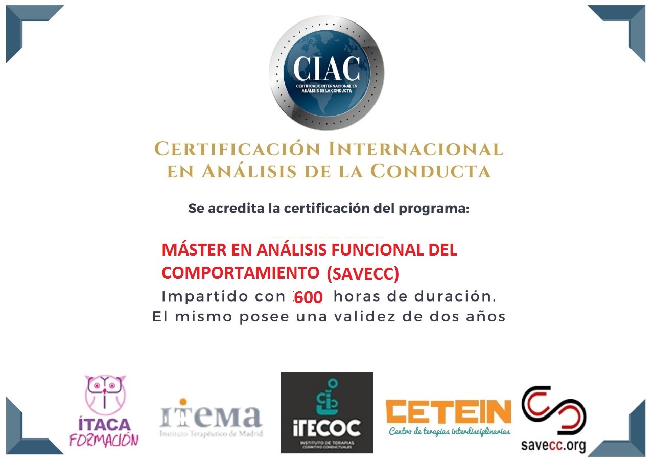 No obstante, desde abril de 2021, el Máster de SAVECC cuenta con el Certificado Internacional en Análisis de la Conducta (CIAC). Ver certificación del Máster (Certificado).